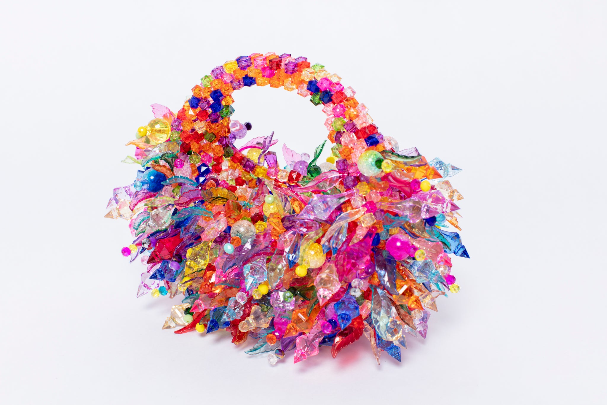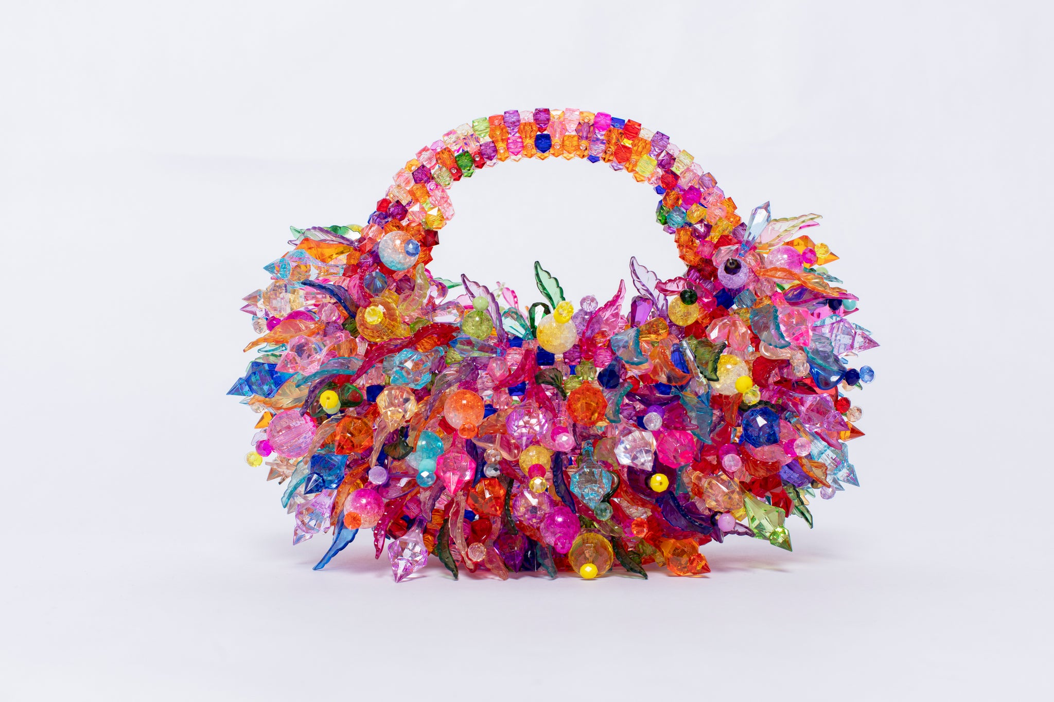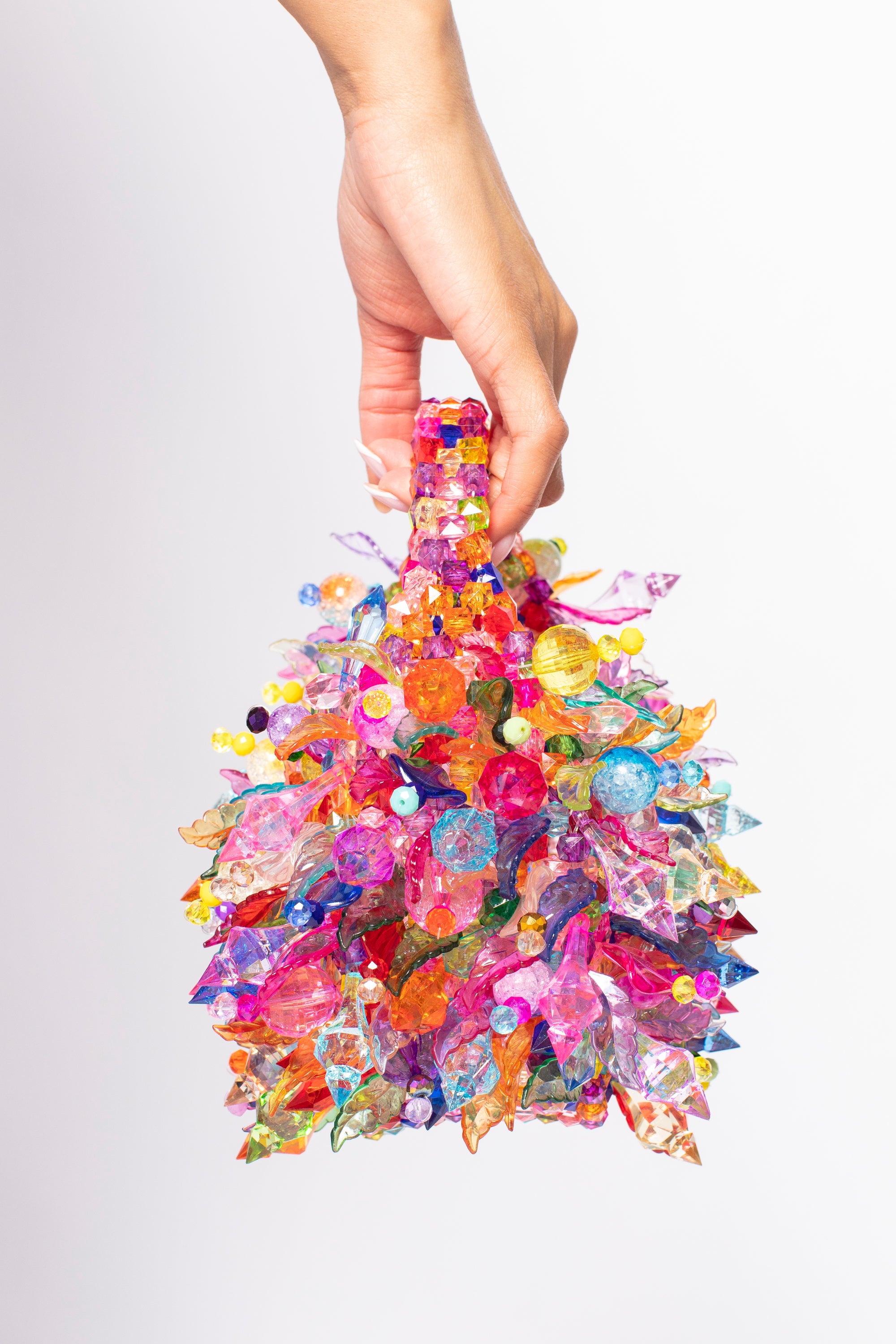 Handcrafted by skilled artisans, this striking mini bag is adorned with an intricate cluster of faceted crystals and sculptural beads that shimmer beautifully with every movement. The layered embellishment creates a vibrant jewel like finish that instantly elevates any evening look.
