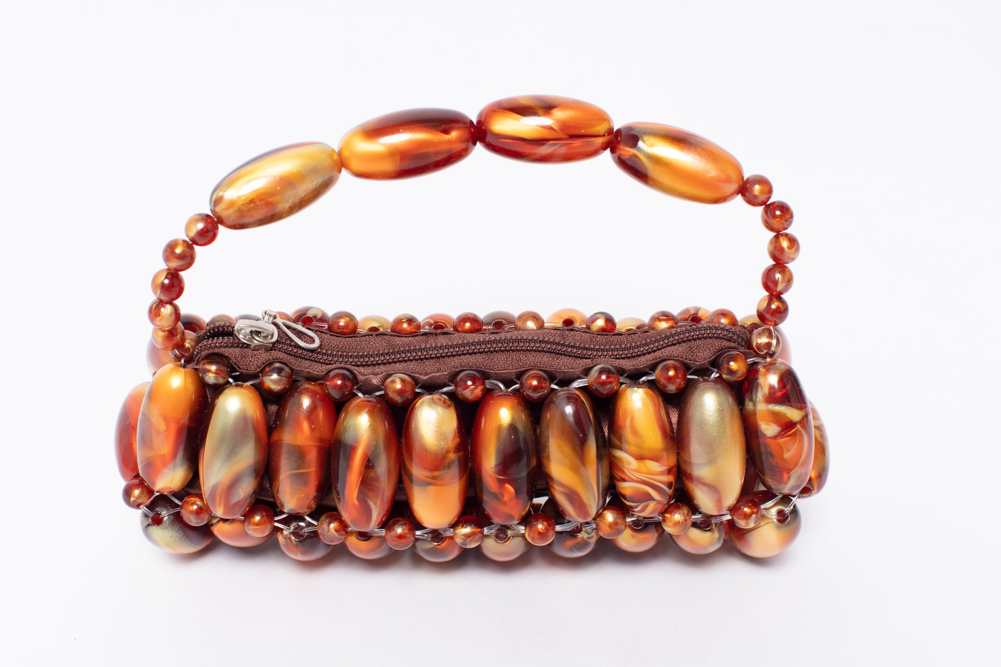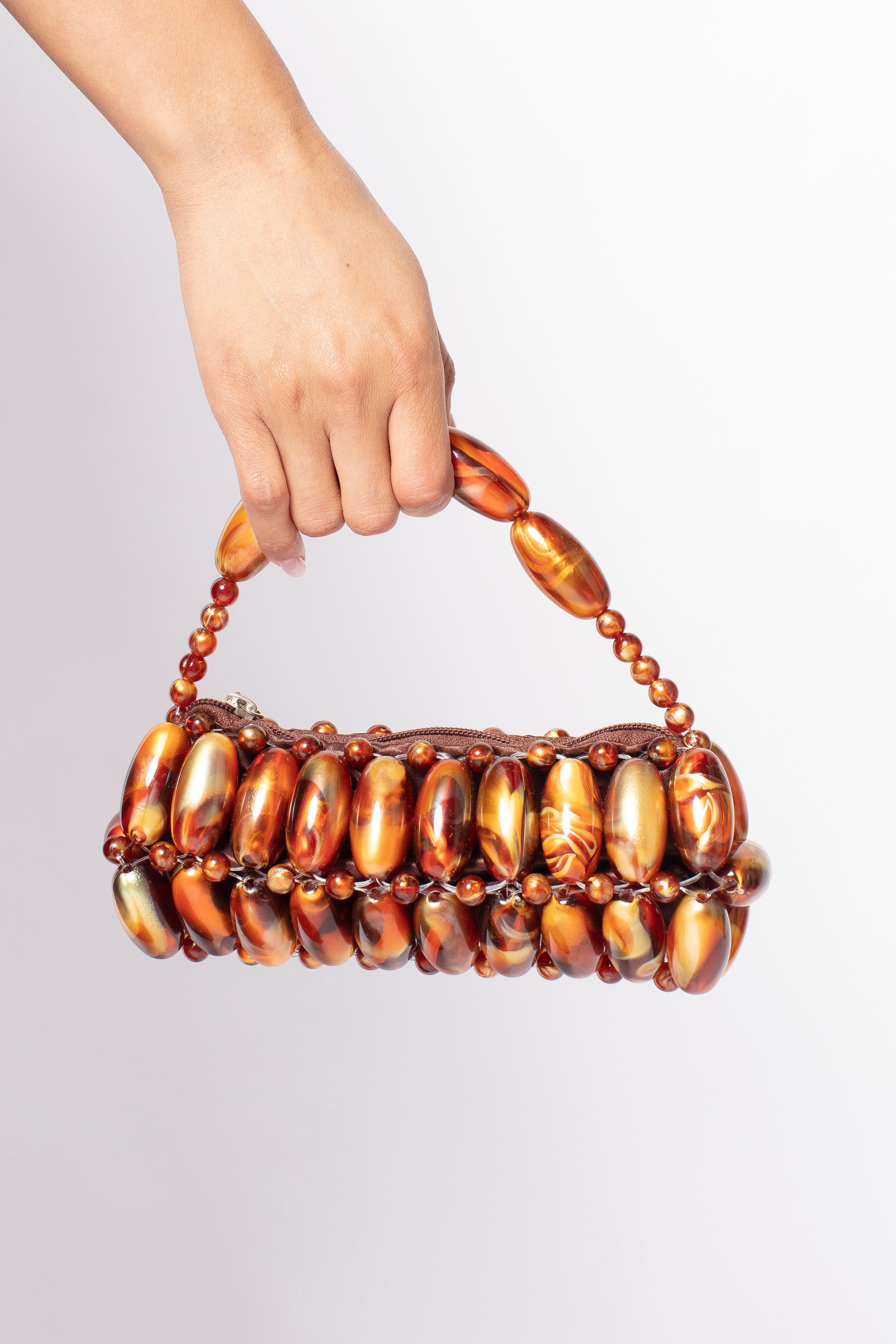 Handcrafted by skilled artisans, this sculptural mini bag is adorned with polished marbled beads arranged in a bold, jewel-like pattern. Each piece reflects the light differently, creating movement, depth and a vibrant finish that instantly elevates any look.
