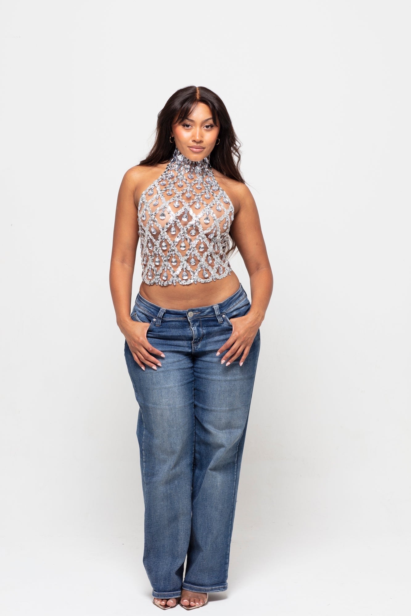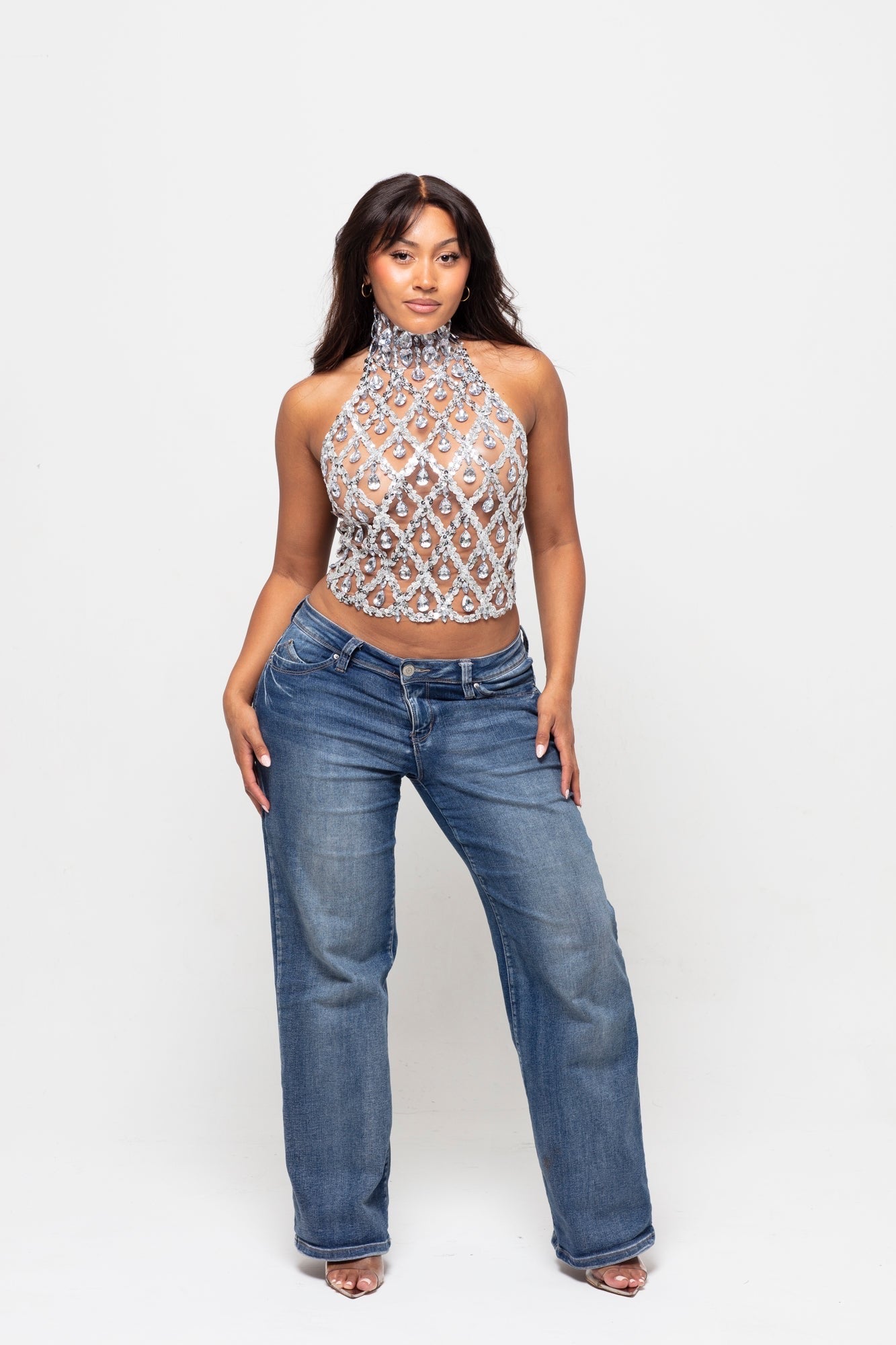 Command attention in Domina, the ultimate statement piece that knows her power. Dripping in hand-embellished golden crystals with a dramatic high neckline and lace-up back, this corset top is all about opulence, attitude, and allure. Whether you’re styling it for a night out or a fashion-forward moment, Domina gives main character energy with zero apologies.